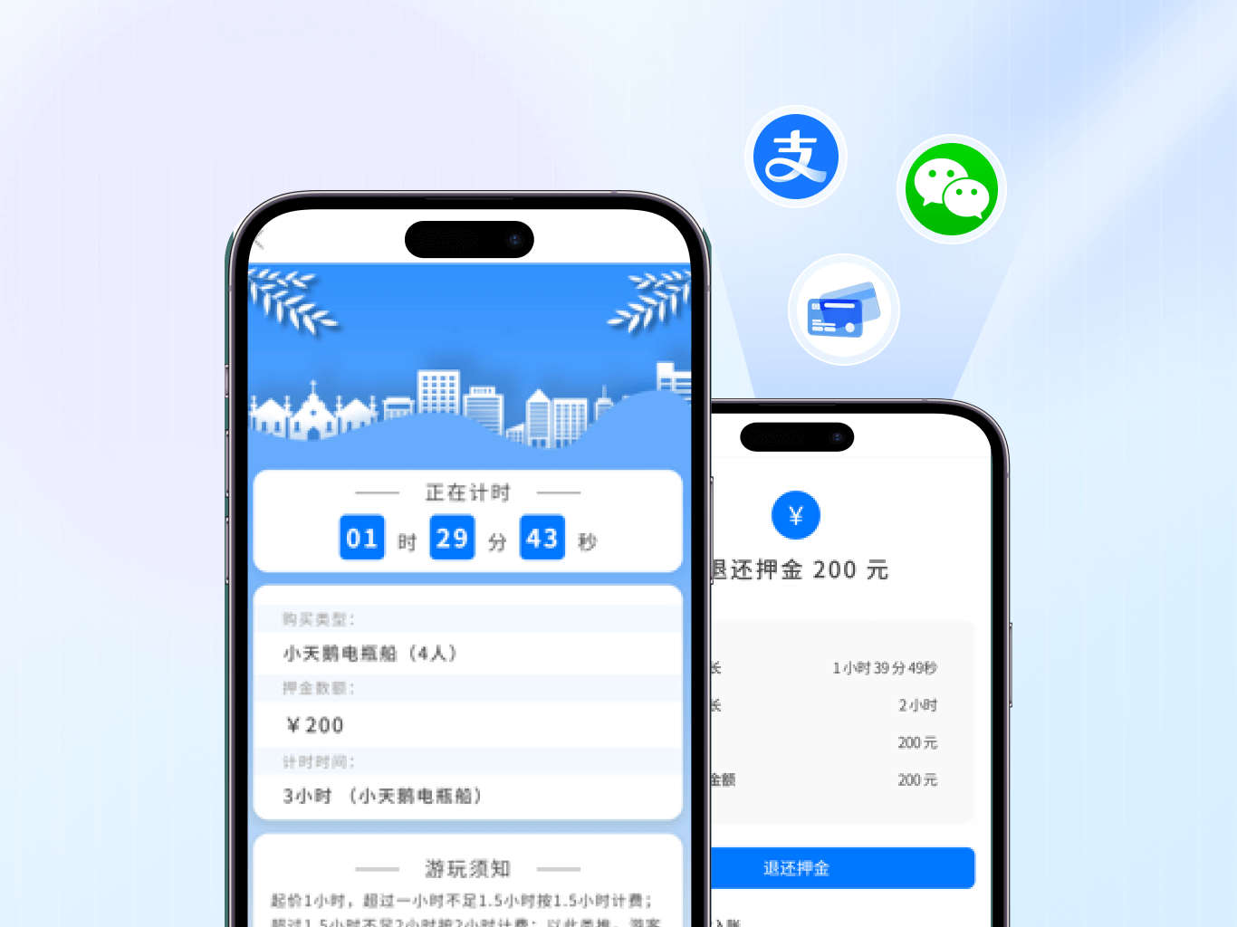 后台可集中管理多类设施配置及押金订单,游客通过扫码即可完成支付与退款操作